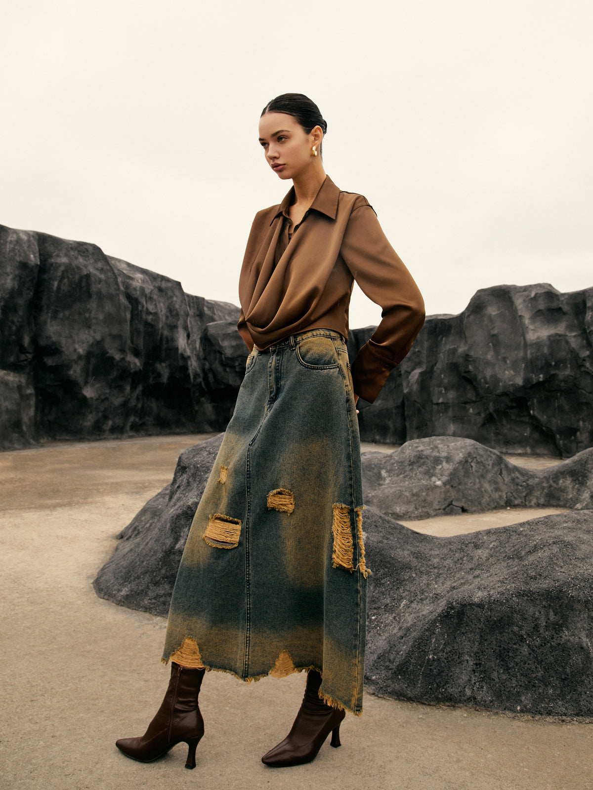 Button Cowl Neck Long Sleeve Shirt
